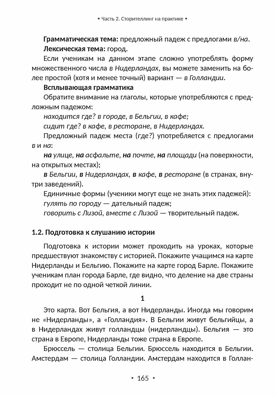 В теоретической части автор подробно объясняет основные принципы сторителлинга, показывая на конкретных примерах, как рассказывание историй может стать мощным инструментом для вовлечения студентов в процесс обучения (особенно на начальном уровне). Здесь рассматриваются ключевые приемы сторителлинга, адаптированные для преподавания русского языка, включая построение увлекательного сюжета, использование повторений, создание запоминающихся персонажей и решение грамматических проблем, характерных для РКИ.