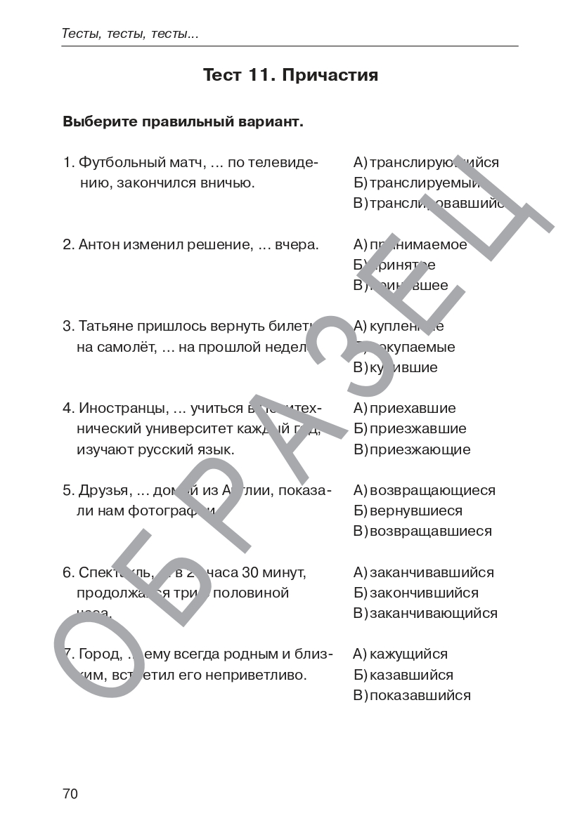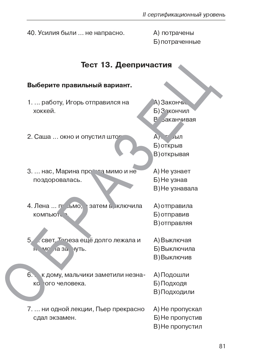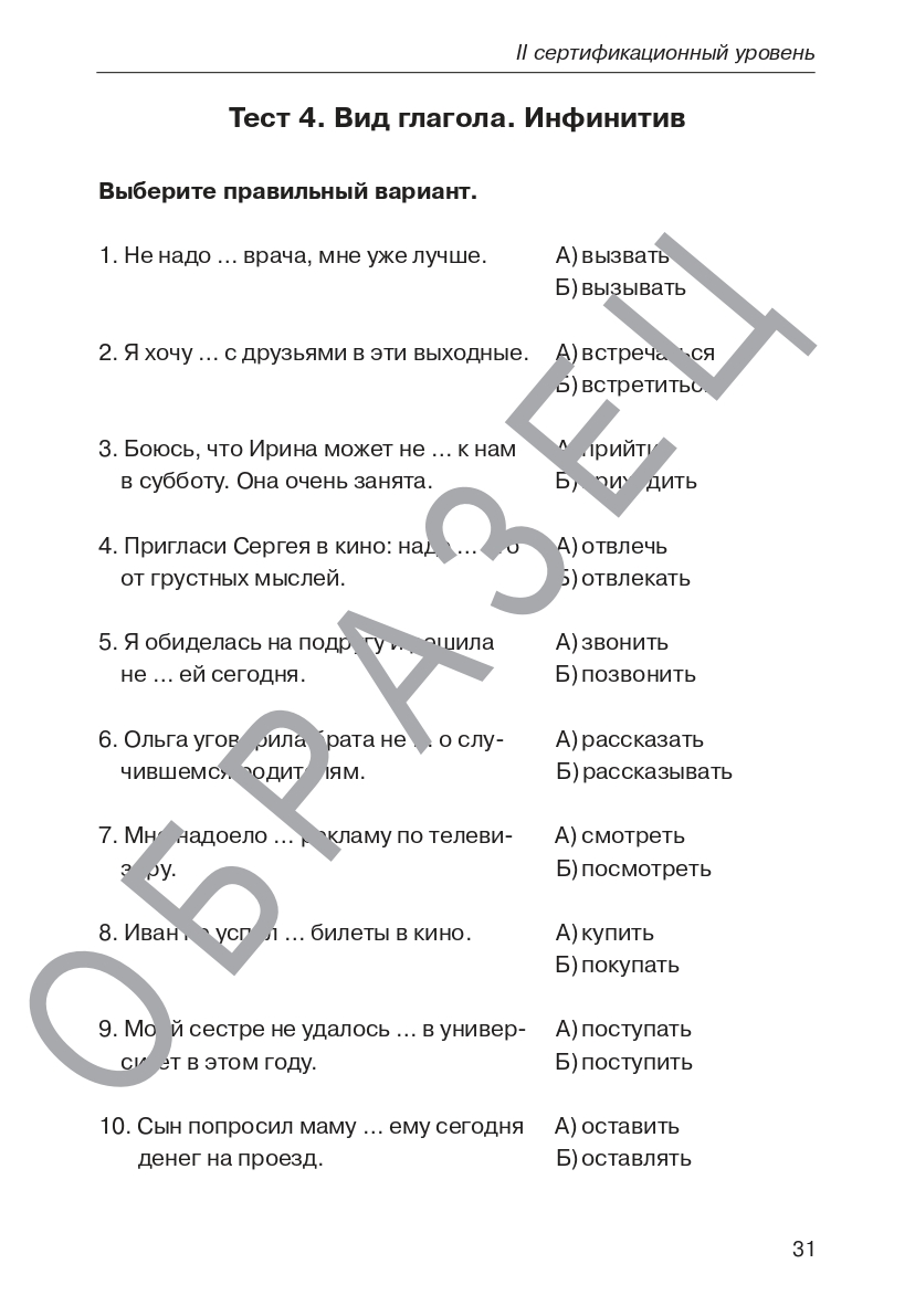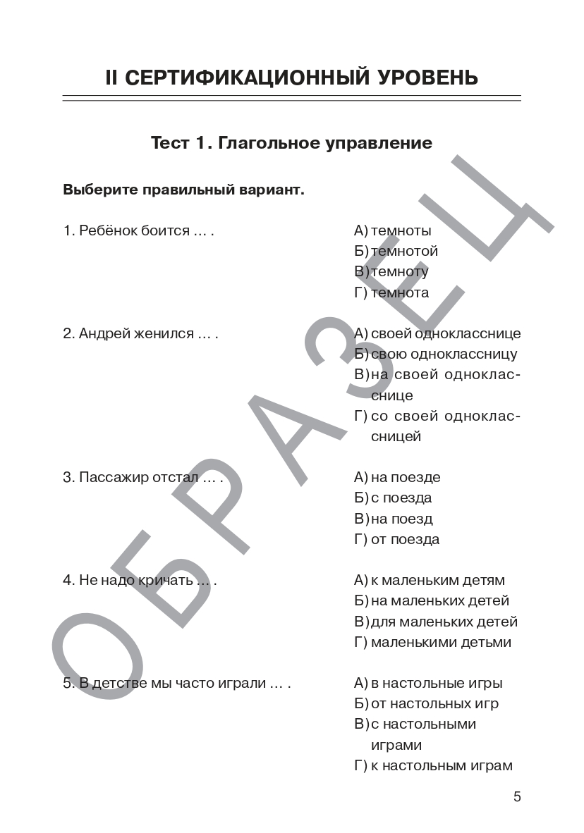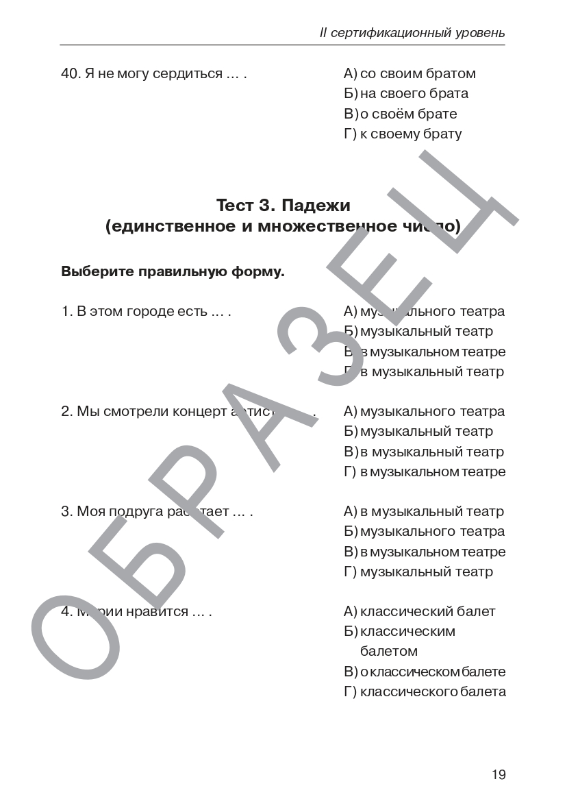 Данное пособие представляет собой набор тренировочных тестов по грамматике русского языка и предназначено для подготовки иностранных учащихся к тестированию на II уровень владения русским языком как иностранным. B2