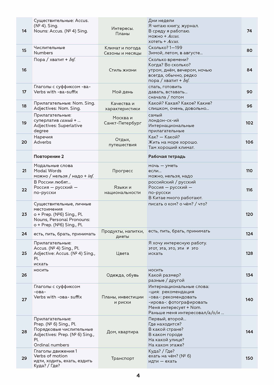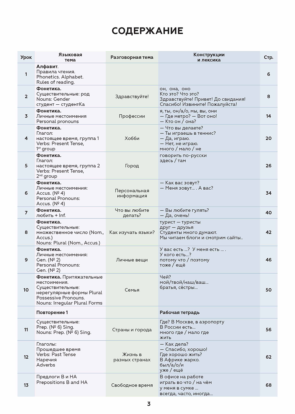 Комплекс предназначен для начинающих изучать русский язык с нуля и состоит из двух частей (1.1 и 1.2). Курс рассчитан в среднем на 80-120 часов аудиторной работы и выводит учащихся на уровень А2. Комплекс включает учебник, дополненный сводным словарем, рабочую тетрадь с ключами к курсу, аудиоприложение.