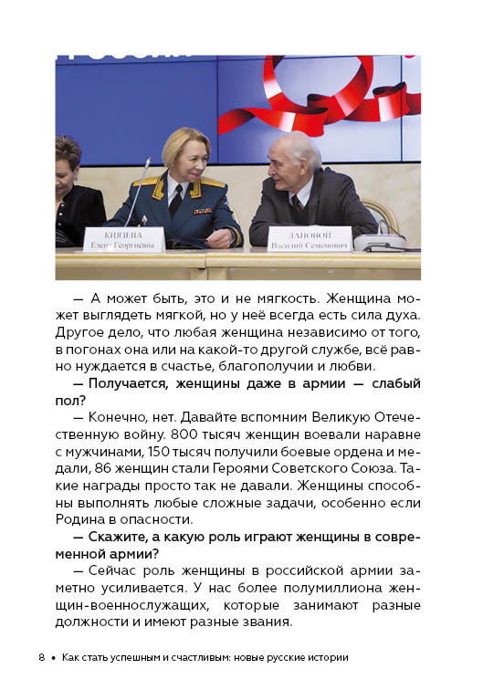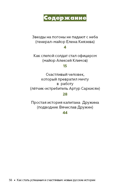 В книгу вошли четыре невероятных истории о тех, кто связал свою жизнь с армией. Какая она, женщина, которая служит в современных Вооружённых силах России? Можно ли стать офицером, потеряв зрение? Как превратить мечту в работу? Почему «море не терпит фальши»? Об этом вам расскажут те, кто выбрал своей профессией – защищать Родину: генерал-майор Елена Князева, майор Алексей Климов, лётчик-истребитель Артур Саркисян и подводник Вячеслав Дружинин.