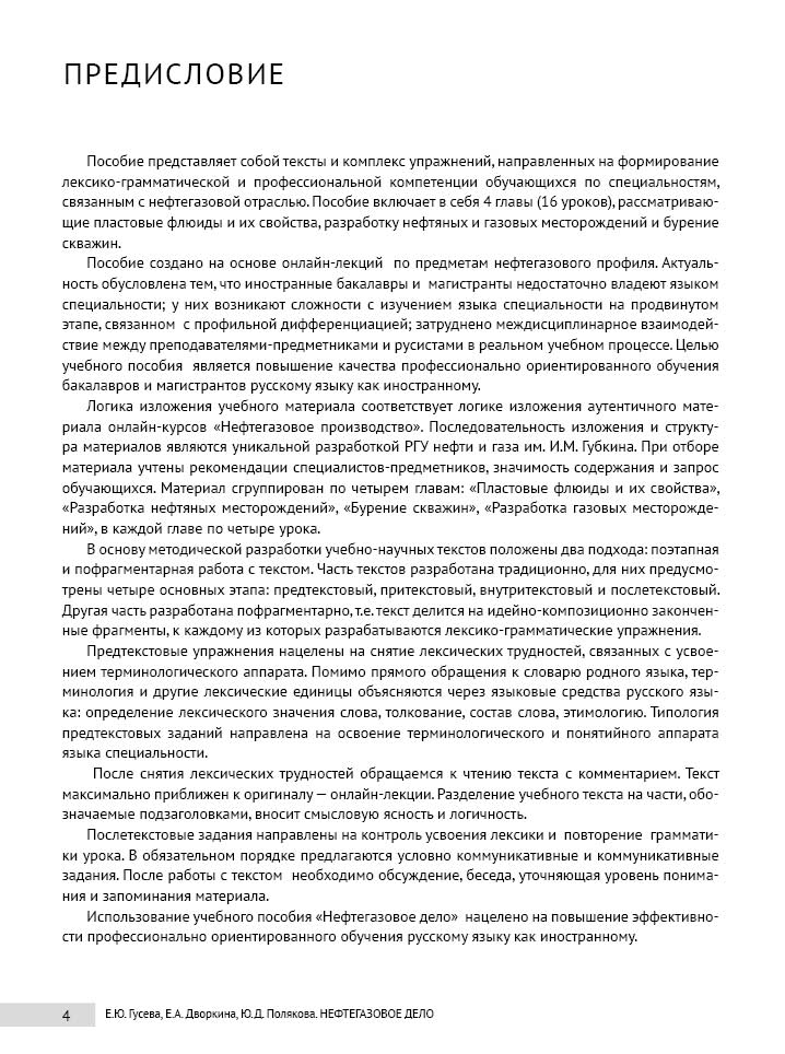 Настоящее издание предназначено для бакалавров и магистрантов, обучающихся в университетах на факультетах, связанных с нефтегазовой отраслью. Пособие рассчитано на подготовку по русскому языку на уровне В1 (ТРКИ-1). Пособие составляют тексты по специальностям нефтегазового профиля. В качестве источника использованы лекции по разработке и бурению нефтяных и газовых скважин, а также по свойствам углеводородных флюидов. Предполагается ознакомление с особенностями научного стиля в его письменной и устной разновидностях, общенаучной лексикой, основными синтаксическими моделями, характерными для языка науки, и формирование языковых и профессиональных компетенций.