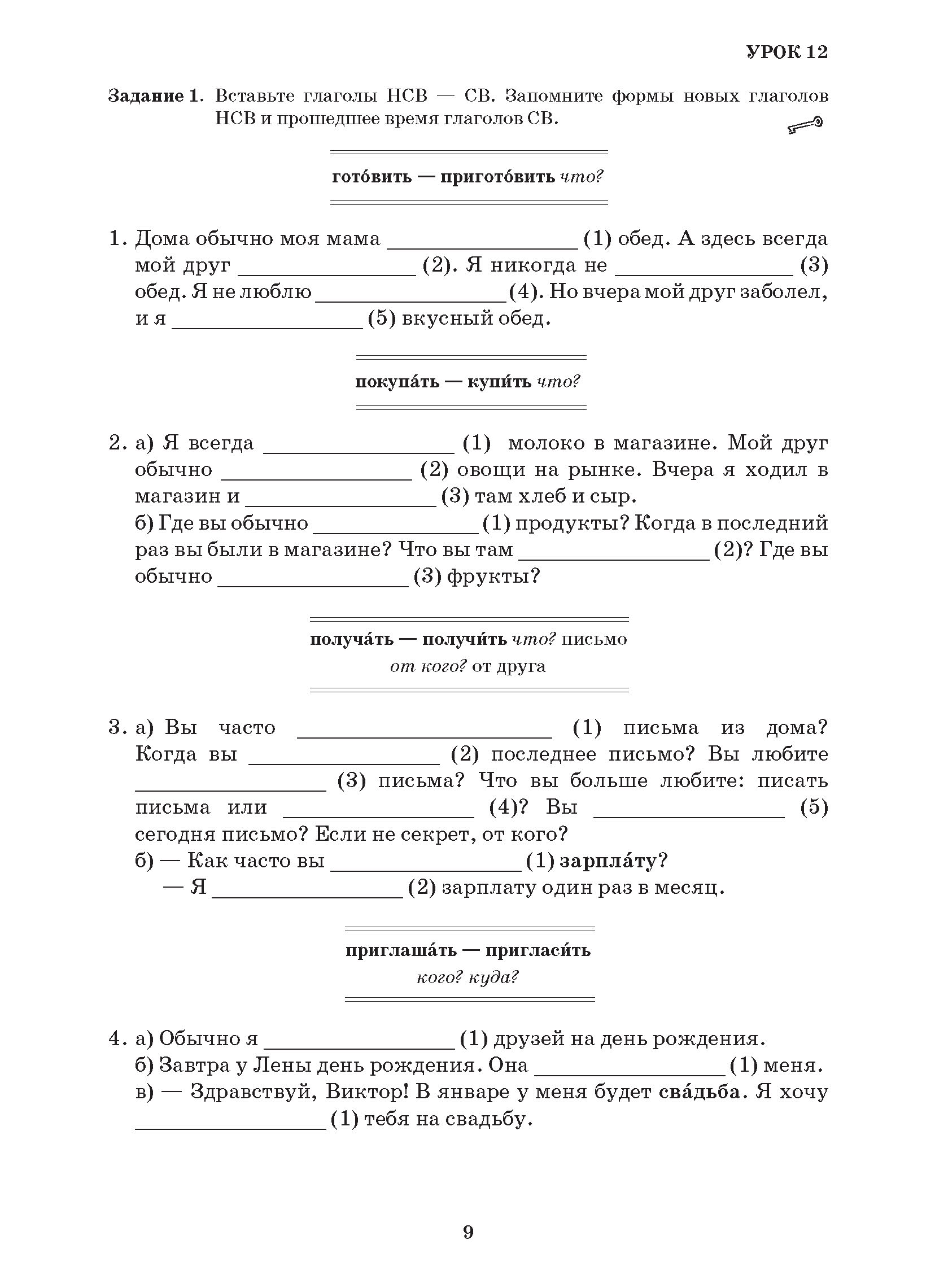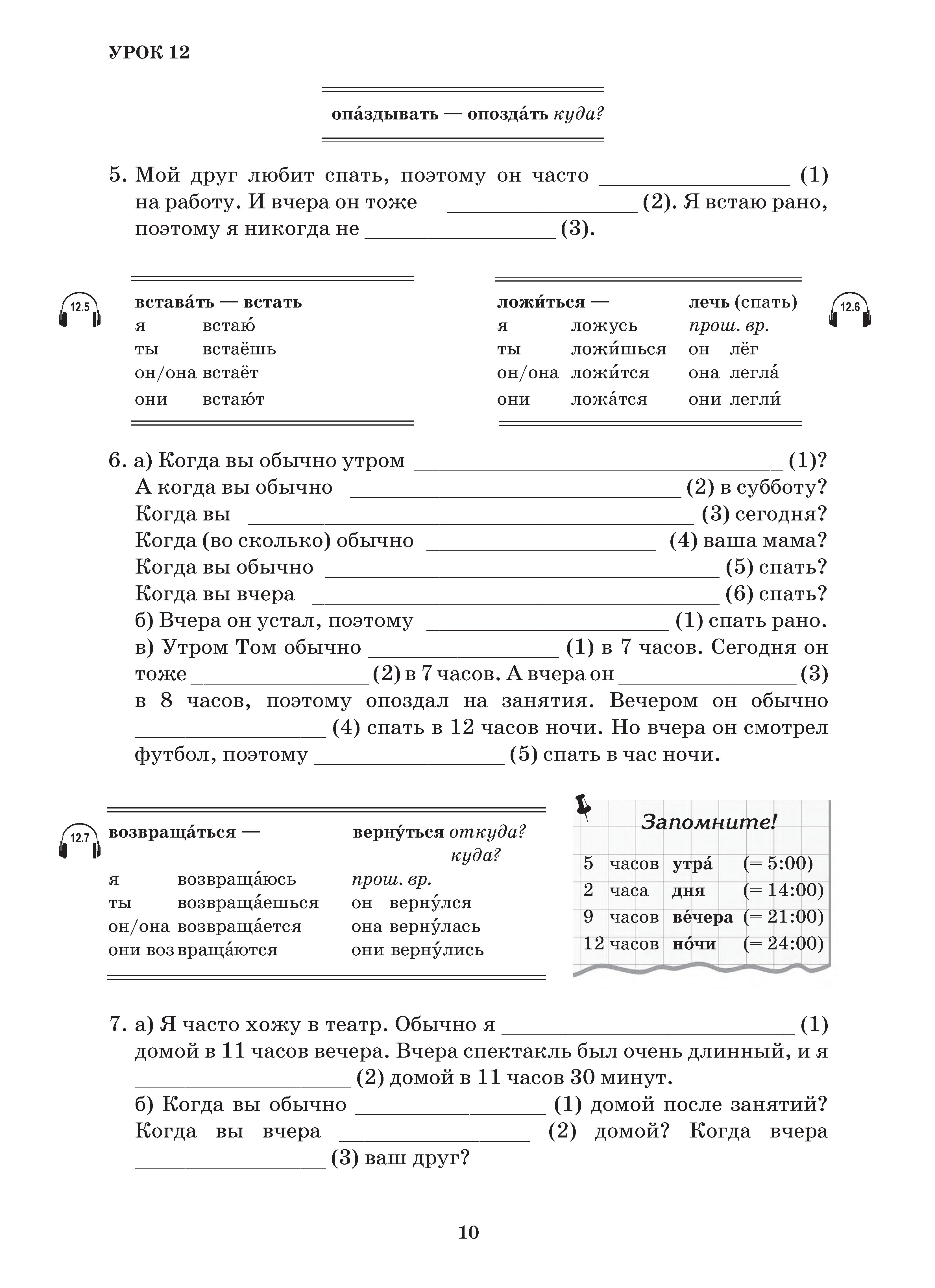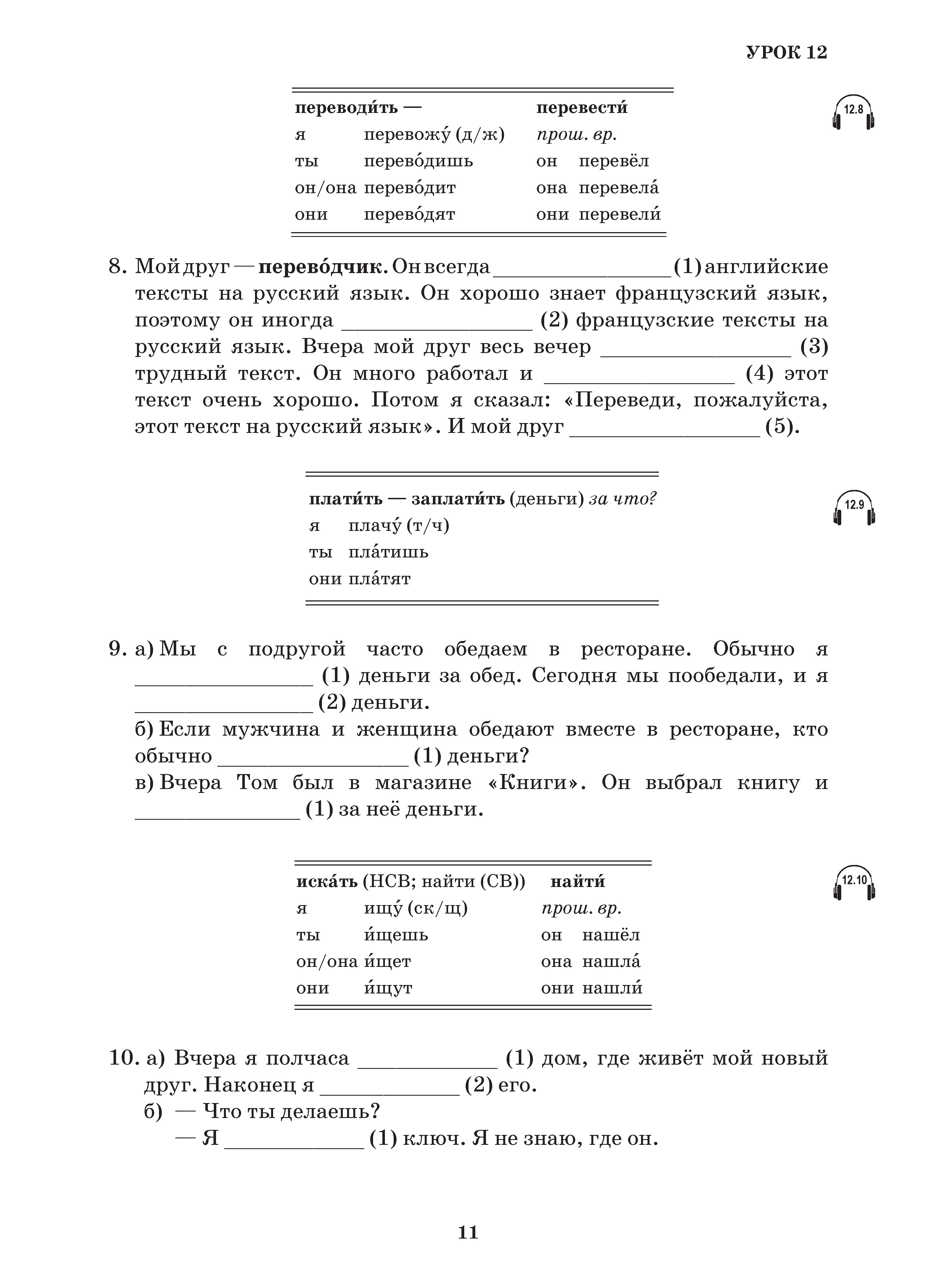 Представлены сведения о видо-временной системе русского глагола, о склонении прилагательных, притяжательных и указательных местоимений, порядковых числительных единственного числа. Учащиеся овладеют основными значениями предложно-падежной системы, научатся вести беседу на темы, связанные с описанием простого события (повествование), адекватно (в соответствии с этикетными нормами) вести диалоги в ситуациях бытового общения. В конце пособия представлены проверочные работы к каждому уроку. Пособие имеет аудиоприложение. QR коды со ссылками на аудиозапись размещены в тексте издания. Ключи к заданиям размещены на сайте издательства.