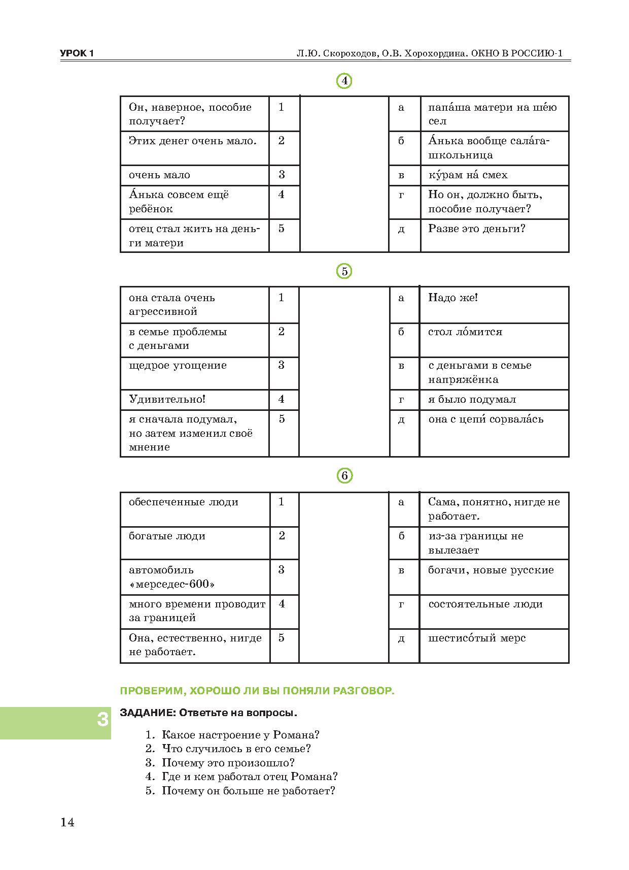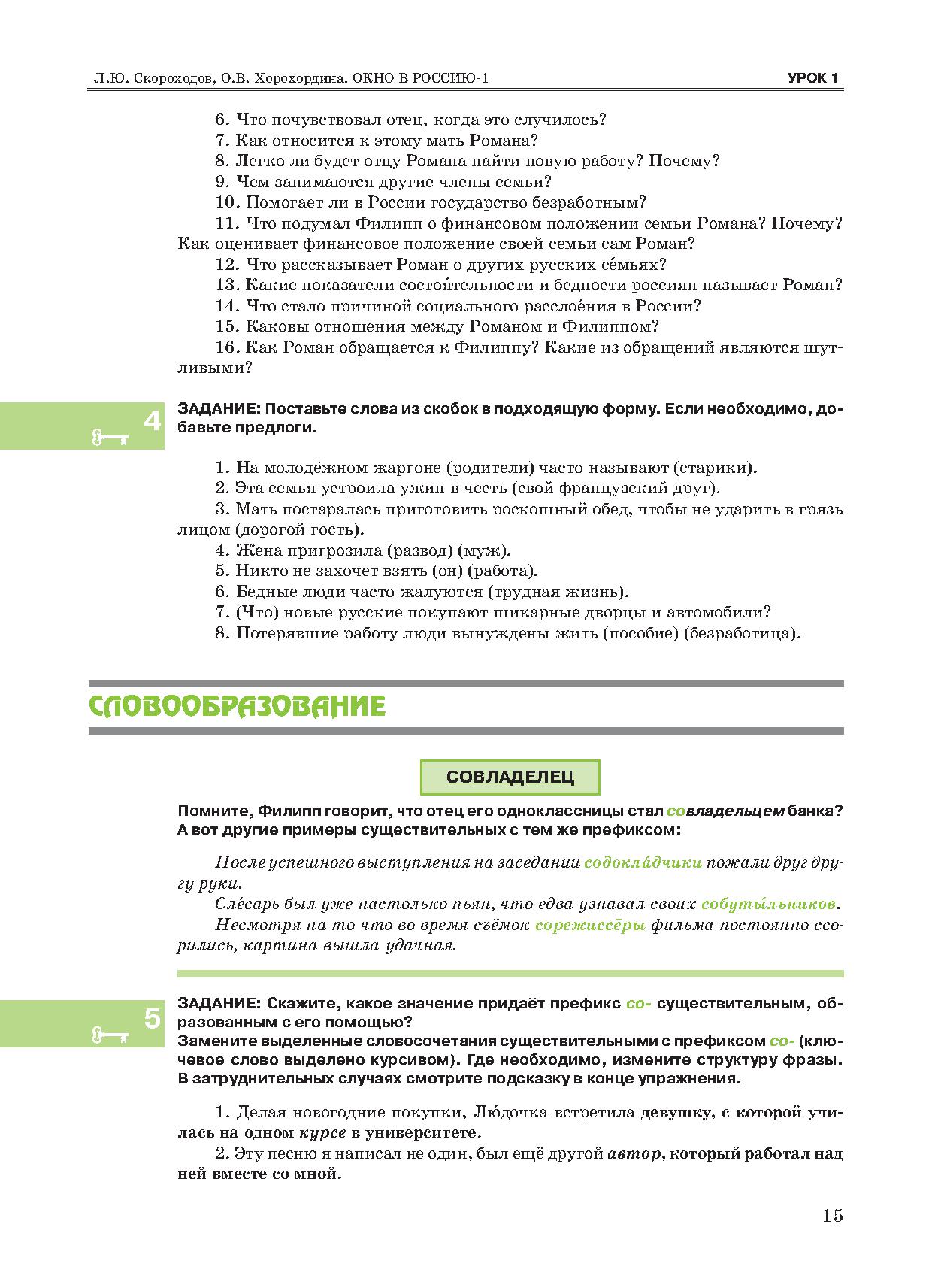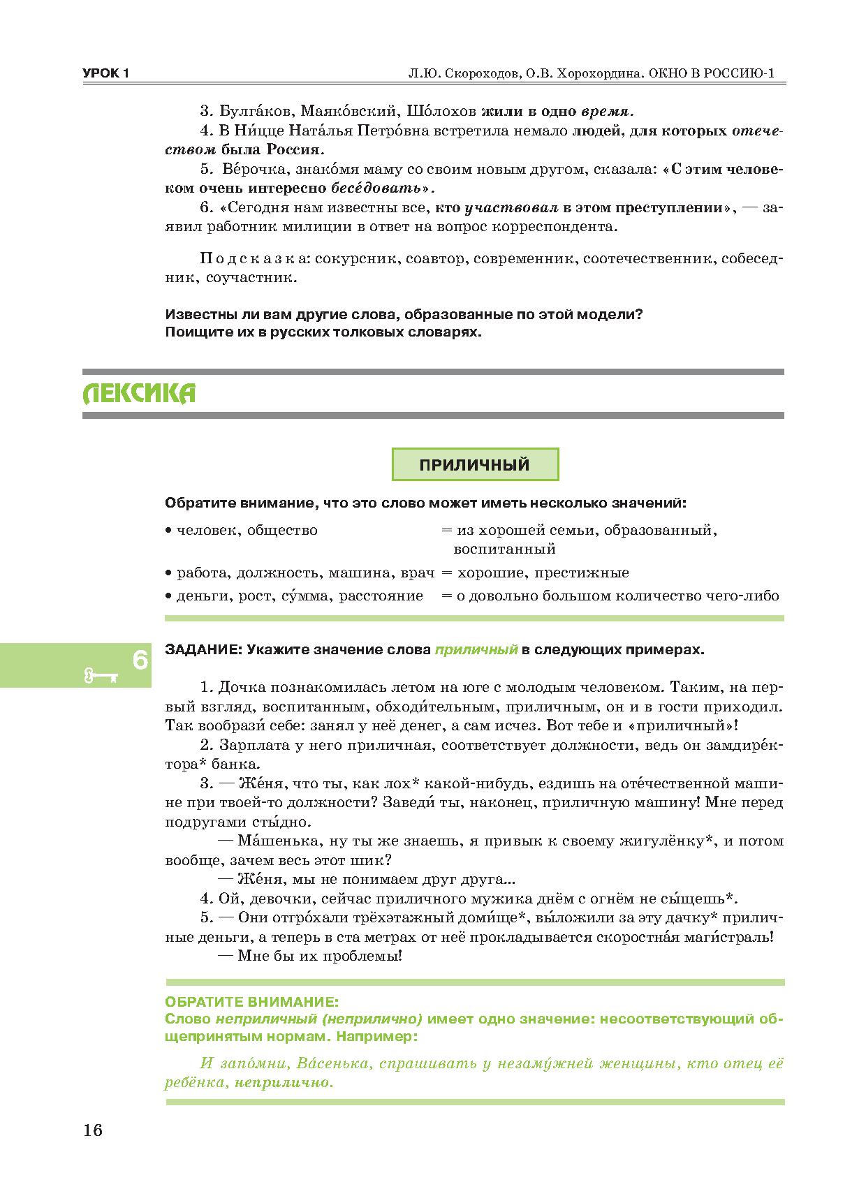 Учебное пособие «Окно в Россию» адресовано изучающим русский язык как иностранный на II–III уровне (B2–C1). Может служить основой для практического знакомства со стилевыми разновидностями русского языка, а также различными сторонами жизни современной России: положение в обществе (с точки зрения материальной обеспеченности и принадлежности к определённой социальной группе), возможность профессиональной реализации; работа, учёба, досуг российской молодёжи; культурные интересы разных слоёв общества (литература, музыка, скульптура, кино). Пособие рассчитано примерно на 120 часов. Авторы отводят большую часть языковых и условноречевых упражнений для самостоятельной работы, снабдив такие задания необходимыми лингвистическими и культурологическими комментариями, а также ключами, данными поурочно.