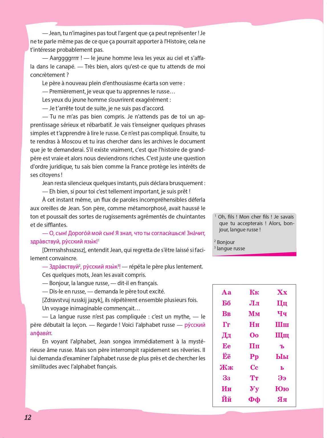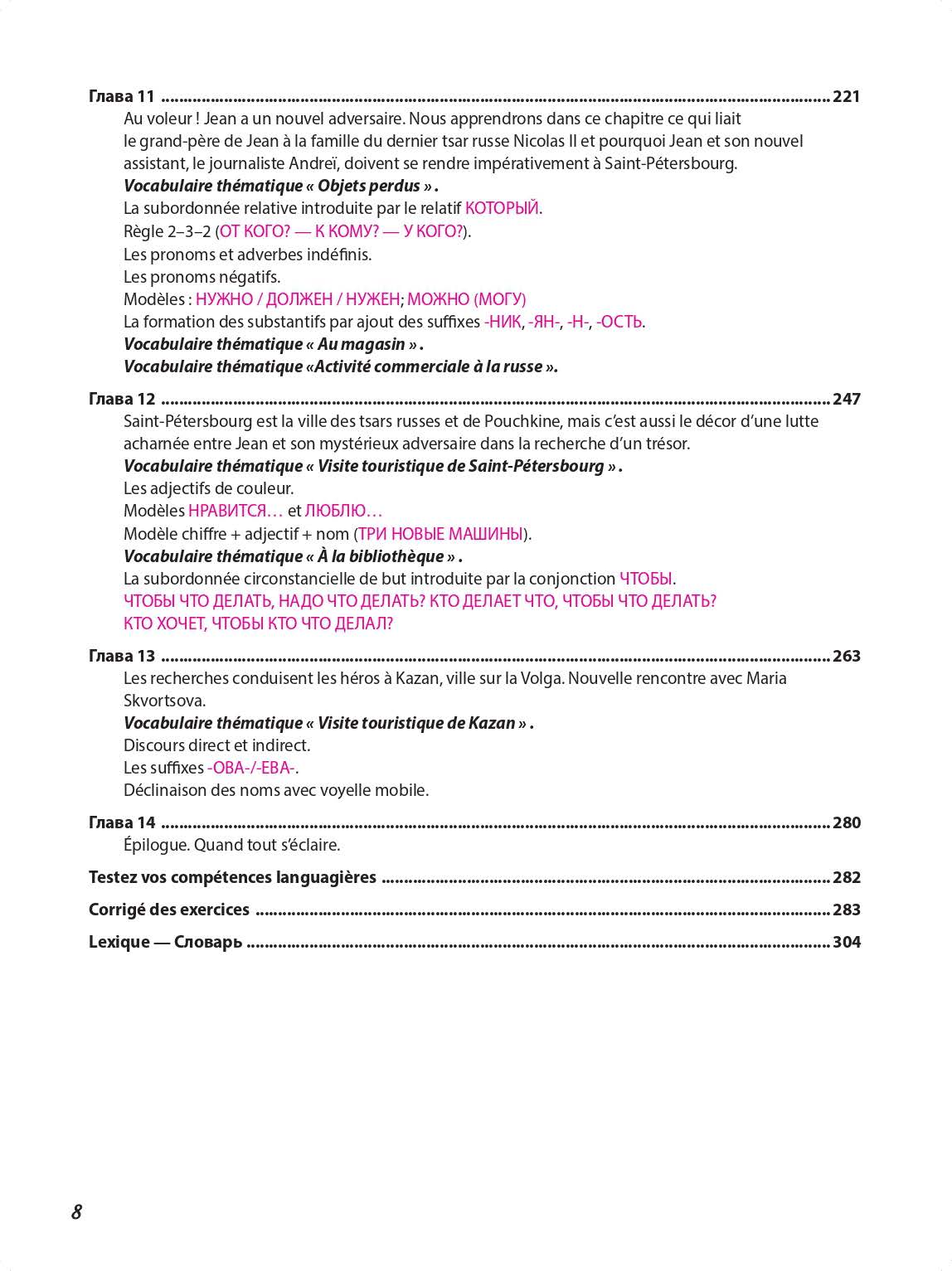 Интенсивный курс русского языка для начинающих . Благодаря своему уникальному формату книга может быть использована в качестве самостоятельного учебника или самоучителя для изучения русского языка, а также дополнительного пособия для аудиторных занятий. Книга предназначена для французских читателей, которые хотят в непринужденной и увлекательной форме овладеть основами грамматики и лексики русского языка и познакомиться с русской культурой. Этот учебник также рекомендуется преподавателям русского языка как иностранного, которые хотят разнообразить и расширить свои методические подходы. (ТЭУ-ТБУ/А1-А2)